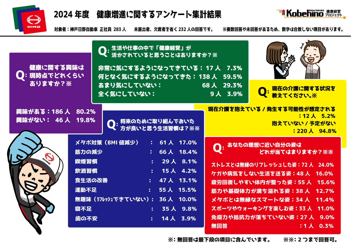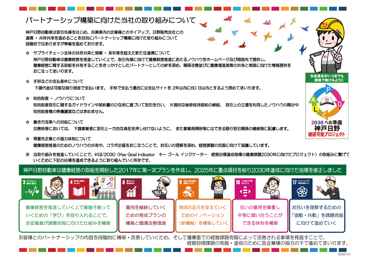 神戸日野自動車は健康経営を実施しており、年間を通じて従業員と共に取り組んでいる運動奨励施策、各種健康系研修を実施した結果をレポートにまとめたものを実施団体に提出し、認定を受けております。